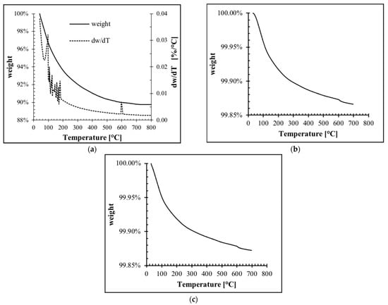 Thermogravimetric analyses for (a) unmodified clinoptilolite and modified by conventional heating, (b) Clinop/ATarC1, and (c) ClinopATarC2.