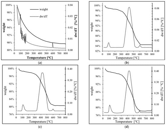 Thermogravimetric analyses for (a) unmodified clinoptilolite and modified by ultrasound, (b) Clinop/ATar25US, (c) Clinop/ATar50US, and (d) Clinop/ATar100US.
