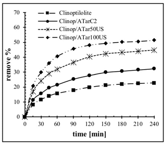 A comparison of the adsorption results for urea and creatinine, using as adsorbent unmodified and modified samples by ultrasound and conventional heating, are presented in Figure 5. It was observed that Clinop/ATar100US had the greatest removal value for urea, 74.5%. Clinop/ATar50US had an adsorption value of 71%, less than Clinop/ATar100US. These results suggest that after 50 min of ultrasound modification, there is no significant difference in acid group incorporation at the clinoptilolite surface.