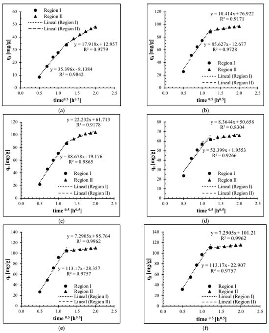 Figure 7 shows the fit of the experimental data to the homogeneous solid diffusion model for urea adsorption. It can be observed that the regression lines deviated from the origin of the coordinate system, which can be attributed to the difference in the mass transfer velocity in the initial and final adsorption steps. The double linear region indicates that many stages conditionate the kinetics of the adsorption process, which must be analyzed individually. The interpretation of the literature for these regions is confusing. Dogan and Alkan [] attribute the initial stage of the curve to the diffusion in the macropores, while Kumar and Porkodib [] explain that such a part informs about the diffusion process in the boundary layer. Therefore, it is considered that stage I, consistent with minor time, corresponds to the adsorption in the zeolite external surface, including macro and mesopores, until this surface reaches saturation. Stage II corresponds to micropore diffusion; this is the real internal diffusion. From this moment, the urea begins to penetrate the least accessible pores, increasing the resistance to mass transport and decreasing the diffusion velocity. Therefore, kdI > kdII means that as the path available to the diffusion is reduced because of the obstruction of some pores, the magnitude of the diffusion parameters is reduced [].