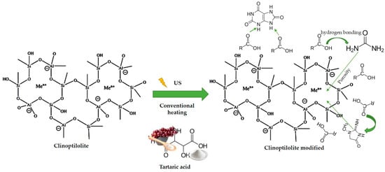 Figure 9 shows the scheme of the modification of clinoptilolite by two methods: conventional heating and ultrasound. Based on the results of FT-IR and TGA, functional groups such as carbonyl and hydroxyl are found on the surface. Weight loss attributed to organic compounds was also detected on the surface. Possibly, there is a link with clinoptilolite through hydrogen bonding electrostatic interactions between the carboxylic acids of tartaric acid and Si+, K+, Al3+, and Ca2+.