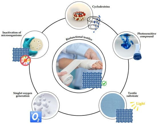 The use of cyclodextrins in textiles for the development of biofunctional fabrics represents an interesting alternative for the advancement of dental, medical, and hospital materials. Cyclodextrins can interact with the chemical groups present in cotton fibers, leading to the formation of a nanostructured surface with specific functional properties, including antibacterial activity. Although there are numerous antibacterial textile finishes, the use of methylene blue as a cyclodextrin host molecule for photodynamic applications in textile materials remains to be investigated. This is because methylene blue is a photosensitive dye capable of generating singlet oxygen (1O2) when illuminated, which inactivates the pathogenic microorganisms that may be present in wounds. The objective of this study was to develop a biofunctionalized and photoactivatable cotton fabric with antimicrobial properties for use in the cosmetic or medical industries. The materials obtained were characterized via scanning electron microscopy (SEM), Fourier transform infrared spectroscopy with attenuated total reflection (FTIR-ATR), the determination of cotton fabric functionalization dyeing variables, colorimetry, UV-VIS spectrophotometry, degradation of 9,10-anthracenediyl-bis(methylene)dimalonic acid (ABDA), photodegradation tests, and microbiological analysis. The results showed that the textile was functionalized with β-cyclodextrin, mainly evidenced by the appearance of the band at 1730 cm−1, indicating the formation of the ester group. Thus, when exposed to light, the non-functionalized material showed greater photobleaching, about 60%, compared to the material treated with cyclodextrin. This result was also reflected in the ABDA degradation kinetics, with the treated material showing 592.00% (first phase) and 966.20% (second phase) higher degradation than the untreated sample. Finally, the photodynamic activity was determined based on the antimicrobial properties of the textile, showing a reduction of more than 99% without exposure to light and 100% when exposed to light. It is believed that this study could open avenues for future research and the development of antimicrobial fabrics, as well as demonstrate the efficiency of the treatment with cyclodextrin in relation to photobleaching.