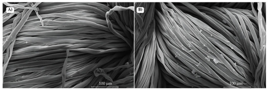 Microscopy images of untreated and β-CD-treated cotton fabric are shown in Figure 2A,B, respectively. The images reveal twists in the cotton fibers caused by the spiraling of cellulose fibrils. The ribbon configuration with twists indicates a longitudinal view of the cotton. As illustrated in Figure 2B, the presence of β-CD can be observed on the surface of the treated cotton fabric, similar to the findings of Sundrarajan [53] and Alzate-Sánchez [54], attesting to the efficacy of the treatment.