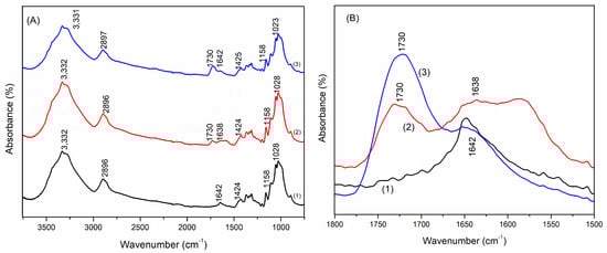 (A) ATR-FTIR spectrum and (B) its expansion in the region between 1800 and 1500 cm−1 of (1) cotton, (2) cotton with β-CD, and (3) cotton with β-CD after washing with NaOH.