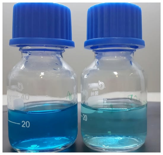 The residual baths from the MB depletion dyeing of fabrics, both with and without β-CD treatment, are shown in Figure 4. A superficial visual analysis reveals that the colors of the residual baths are lighter in the samples treated with β-CD. Theoretically, this suggests that the textile samples treated with β-CD will exhibit greater color intensity.