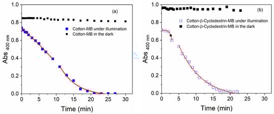 ABDA degradation rate of MB-dyed textile: (a) without treatment and (b) with β-CD. Black symbol: absorbance in the presence of light; red symbol: absorbance in the dark.