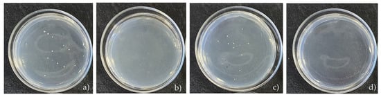 Microbiological analysis of samples: (a) dyed fabric with MB, not treated with β-CD, in the absence of light; (b) dyed fabric with MB, not treated with β-CD, in the presence of light; (c) dyed fabric with MB, treated with β-CD, in the absence of light; (d) dyed fabric with MB, treated with β-CD, in the presence of light.