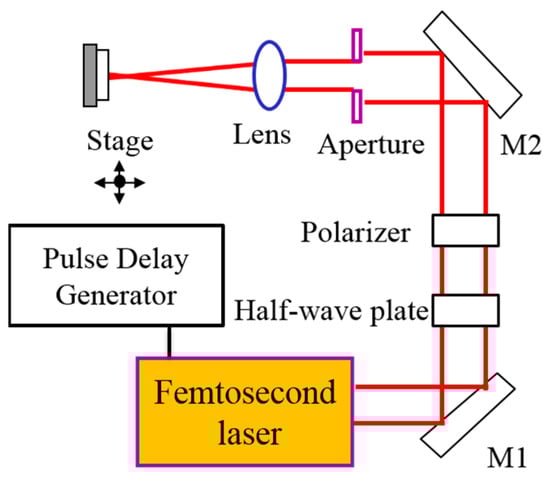 An fs Ti/sapphire laser with a regenerative amplification system (wavelength λ = 800 nm, full width at half maximum = 50 fs, pulse energy E < 3.5 mJ, repetition rate f = 1 kHz) was employed in the experiment (Figure 1). The laser beam was linearly polarized with a Gaussian energy distribution (M square factor < 1.2). A half-wave plate and a polarizer were used to change the laser energy. After passing through a circular aperture of diameter 1 mm, the laser beam was focused by a lens of focal length 150 mm. The sample was placed perpendicular to the laser beam, and the measured laser spot size was in the range of 75 μm under different experimental conditions. The laser beam scanned the sample surface by moving the sample stage with a computer-controlled three-dimensional micro stage (Figure 2). Scanning speed was varied in the range of 75~500 μm/s at a 1 kHz pulse repetition rate. Correspondingly, each spot was irradiated with 150~1000 laser pulses by the beam scanning method summarized in Table 1. The scan line overlap was set to be 33%. Key factors that determine the morphology of LIPSS include laser fluence, scan speed, and polarization direction. The laser fluence controls the amount of energy delivered to the surface area, directly influencing the formation and characteristics of ripples. Adjusting the scan speed and spot size allows for precise tuning of the density and distribution of these structures. Additionally, the polarization direction of the laser beam plays a critical role in determining the orientation and symmetry of the LIPSS. By carefully controlling these parameters, it is possible to engineer the desired surface topography with a high degree of precision.