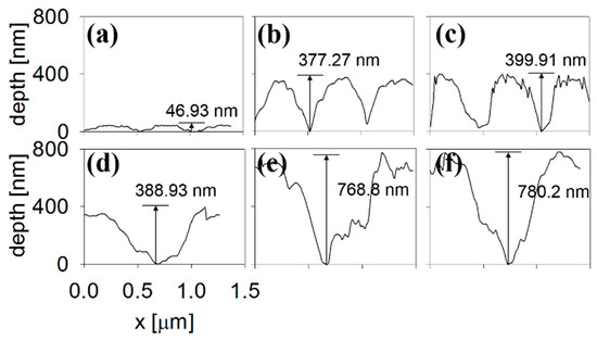 Depth profiles of nanovalleys after (a) 150, (b) 400, and (c) 1000 laser pulses and those of nanoholes after (d) 150, (e) 400, and (f) 1000 laser pulses at F = 1.3 J/cm2.