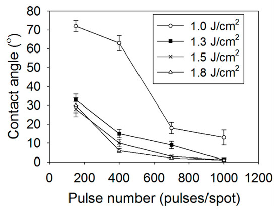 The wetting properties of the laser-modified copper surface were evaluated by measuring the static CA of water droplets. The CA decreased rapidly with the development of the LIPSS, i.e., with the pulse number (Figure 6). The CA was ~75° for a bare copper surface. Successive irradiation of the laser pulse decreased the CA (Figure 6a–c), and the surface became superhydrophilic (CA < 1°) after ~1000 pulses/spot at F = 1.3 J/cm2 (Figure 6d). The effects of F and N on the CA were measured by varying them (Figure 7). In the near-threshold fluence region (F = 1.0~1.3 J/cm2), the CA was critically dependent on F, but it hardly affected the CA in the high-fluence region (F = 1.3~1.8 J/cm2). Therefore, a detailed analysis on the effect of N was conducted at F = 1.3 J/cm2.