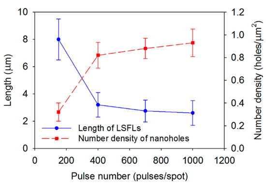 The results exhibited in Figure 7 suggest that the laser-induced structures modified the wettability. At a fixed fluence F = 1.3 J/cm2, with increasing N from 150 to 400, the length of the ripple drastically decreased, and the number density of the nanoholes at the ends of the ripples thus increased (Figure 8). Figure 5 indicates that both the nanovalleys and nanoholes became deeper from 47 to 377 nm and from 389 to 769 nm, respectively. Correspondingly, the CA decreased from 33 to 15°. These observations indicate that the nanoholes contributed significantly to the reduction in the CA. As N was further increased from 400 to 700, neither the length of the nano ripples nor the number density of nanoholes increased significantly. Nevertheless, the increased pulse number changed the wettability from hydrophilic (CA~15°) to superhydrophilic (CA~0°). This transition to superhydrophilicity is attributed to formation of “nanoclusters” on LSFL, as shown in Figure 4b and Figure 9c. It is known that added nanostructures on a hydrophilic surface can make the surface superhydrophilic (<1°) [50,51]. Kietzig et al. [29] fabricated a hydrophilic surface with CA~20° by femtosecond laser irradiation with a fixed pulse number (120 pulses/spot), which agrees with the result of this work (F = 1.3 J/cm2, 150 pulses/spot). However, further increase in the pulse number up to 1000 pulses/spot (F = 1.3 J/cm2) generated nanoclusters on the LIPSS, which is believed to cause the superhydrophilicity of the surface.
