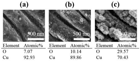 The wettability of a surface is not only a function of the morphological structure of the surface but also a function of surface chemistry. Especially, an oxide layer makes the surface of a metal more hydrophilic than that of the base metal (Cu, in this work) [2]. The fs laser irradiation on the Cu sample generated an oxide layer on the surface, which was confirmed by EDS (Figure 9). The oxygen content was much higher on the laser-treated surface than on the bare Cu surface (<1 atomic%). Oxygen content increased from 7 to 30 atomic% as the pulse number N was enlarged from 150 to 1000 at F = 1.3 J/cm2. To analyze the chemical composition in detail, XPS was performed and detected three elements: Cu, O, and C. Figure 10 shows the high-resolution XPS spectra over the binding energy range 928–940 eV, corresponding to the Cu 2p3/2 spectra [52]. Three components corresponding to the three peaks in the spectra, namely Cu/Cu2O (932.7 eV), CuO (933.8 eV), Cu(OH)2 (935.1 eV), were identified as listed in Table 2. These results confirm the formation of copper (II) oxide (CuO) and copper (II) hydroxide (Cu(OH)2) by oxidation of copper in successive irradiation of fs laser pulses. The wetting characteristics of CuO and Cu(OH)2 are both hydrophilic. Therefore, surfaces composed of those layers can become superhydrophilic (<1°) when nanostructures are formed on them [50,51].
