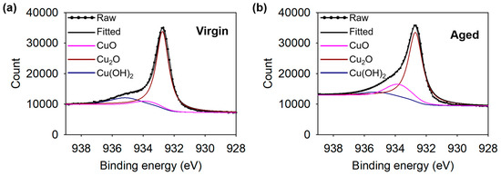 XPS spectra of a Cu 2p3/2 region: (a) a virgin sample and (b) an aged sample.