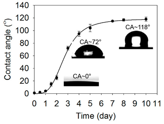 Immediately after the laser treatment, the surface exhibited superhydrophilic characteristic (F = 1.3 J/cm2, N = 1000 pulses/spot). However, the contact angle increased over time and reached 118° after 10 days (Figure 11). The sample immediately after the laser irradiation, named “virgin sample”, had Cu(OH)2 and CuO. However, Cu(OH)2 was spontaneously decomposed to CuO and water at exposure of air condition, as it is metastable [53].