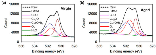 Figure 10 and Table 2 show such trends over time, i.e., the decomposition with increasing CuO signal and decreasing Cu(OH)2 signal. The sample exposed to air for 10 days, named “aged sample”, thus had a relatively large CuO content. Wang et al. observed the transition of a superhydrophilic CuO surface to a superhydrophobic surface by aging and attributed the transition to the effect of physically adsorbed oxygen [54]. Similarly, the adsorbed oxygen molecules reduced the hydrophilicity in this work. The observed O 1s spectra (Figure 12) were composed of five peaks: (1) CuO at 529.9 eV, (2) Cu2O at 530.5 eV, (3) Cu(OH)2 at 531.7 eV, (4) physically adsorbed oxygen molecules O2 at 531.5 eV, and (5) physically adsorbed H2O at 533.0 eV [54,55]. Figure 12 confirms that the peak of physically adsorbed oxygen increased significantly in the aged sample.