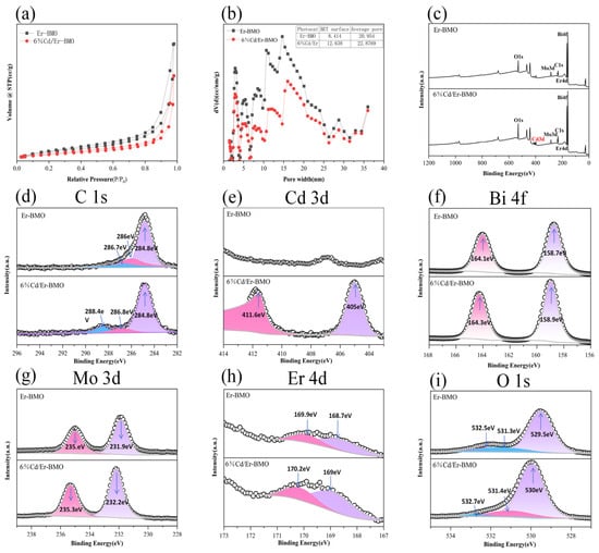 (a) N2 adsorption/desorption isotherms of Er-BMO and 6% Cd/Er-BMO; (b) pore size distribution of Er-BMO and 6% Cd/Er-BMO and the XPS spectra of Er-BMO and 6% Cd/Er-BMO; (c) full spectra of Er-BMO and 6% Cd/Er-BMO; (d) C 1s; (e) Cd 3d; (f) Bi 4f; (g) Mo 3d; (h) Er 4d; (i) O 1s.