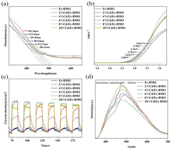 The photocatalytic performance of materials is closely related to the recombination of electrons and holes as the photoexcitation, generation, separation, and recombination of electron-hole pairs have a significant impact on the efficiency of the photocatalytic reaction. As such, the electron-hole-related properties are analyzed by measuring the UV-visible diffuse reflectance spectrum, transient photocurrent response, and photoluminescence spectrum to understand the optical properties of the material in one step. As shown in Figure 3a, the UV spectrum of Er-BMO has a band gap absorption edge near 471.23 nm. Compared with Er-BMO, upon the increase in the Cd2+ doping ratio, the light absorption range of Cd/Er-BMO in the visible light region gradually undergoes a slight red shift, indicating that its light absorption capacity continues to increase and its photocatalytic efficiency continues to improve. The red shift phenomenon stops at 6% Cd/Er-BMO (493.30–513.19 nm). Upon the continued increase in the Cd2+ concentration, a slight blue shift (513.19–484.11 nm) gradually occurs. The red shift indicates that Cd2+ doping can broaden the light absorption range of Er-BMO and enhance visible light absorption, which leads to the generation of more electrons and holes and, eventually, may improve the photocatalytic reaction efficiency []. The subsequent blue shift can be explained by the increased Cd2+ doping concentration. An excessive exposure resulted in a change in the Er-BMO structure. In addition, new absorption peaks were found at 481.8 and 614.8 nm, which can be attributed to the transition of erbium ions 4F3/2, 5/2 and 4F9/2 from the 4I15/2 ground state to the excited state, further confirming that Er3+ can provide the energy upconversion centre and promote the transfer of electrons in the system []. By plotting the relationship between (αhν)2 and photon energy (hν), the band gap energy (Eg) of the Cd2+-doped Er-BMO photocatalyst can be calculated; this is shown in Figure 3b. In the figure, α, h, and ν are the absorption coefficient, Planck constant, and optical frequency, respectively. As can be seen from Figure 3b, the band gaps of Er-BMO, 2% Cd/Er-BMO, 4% Cd/Er-BMO, 6% Cd/Er-BMO, 8% Cd/Er-BMO, and 10% Cd/Er-BMO are 2.81, 2.72, 2.63, 2.60, 2.74, and 2.78 eV, respectively. The energy band of the Cd2+-doped Er-BMO photocatalyst is reduced in line with the trend in adsorption edge, and the minimum energy band is displayed at 6% Cd/Er-BMO. The smaller the band, the narrower the band width. The narrow band width can improve the photocatalytic efficiency. Therefore, 6% Cd/Er-BMO showed the largest photocatalytic activity [].