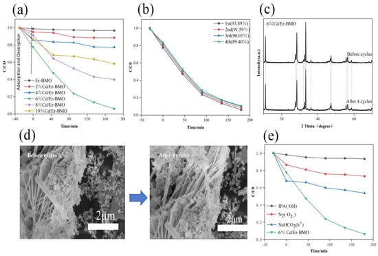 The transient photocurrent method is a widely used characterization technique to detect charge carrier photogeneration and extraction kinetics in optoelectronic devices. In order to illustrate the carrier separation efficiency, the response speed [] and the calculated transient photocurrent response is shown in Figure 3c. As shown in Figure 3c, the magnitude of the photoresponse intensity was 6% Cd/Er-BMO > 2% Cd/Er-BMO > 10% Cd/Er-BMO > 8% Cd/Er-BMO > 4% Cd/Er-BMO > Er-BMO, among which the photoresponse intensity of 6% Cd/Er-BMO was the largest. This proves that the content of electron-hole pairs generated by its photoexcitation is the highest. Compared with that of Er-BMO, the photoresponse intensity of Cd/Er-BMO increased to varying degrees, indicating that Er-BMO crystals can generate more electron-hole pairs under photoexcitation when doped with Cd2+, thereby further promoting the photocatalytic reaction. PL is a non-destructive and non-contact optical method for probing the electronic structure of materials. When light hits the sample, it begins a process called photoexcitation, in which the light is absorbed and excess energy is given to the material []. In addition, photoluminescence (PL) spectroscopy can be used to further analyze the separation and transport of photogenerated charges in materials and to further study the recombination efficiency of photocarriers in photocatalysis []. This is the spectrum of the intensity or energy distribution of light with different wavelengths formed by the recombination of electrons and holes in the quasi-equilibrium state of the material. The higher the peak value, the higher the electron-hole recombination efficiency of the material and the worse the photocatalytic performance []. The PL spectra of Er-BMO and Cd/Er-BMO are shown in Figure 3d. The typical response peaks are identified in the emission spectra of Er-BMO and Cd/Er-BMO. Compared with the strong response peak of Er-BMO, Cd-BMO shows a relatively weak peak (the intensity of 10% Cd/Er-BMO is the highest), which may be attributable to an excessive doping concentration leading to the photoinduced recombination between electrons and holes and the subsequent increase in the PL intensity []. This indicated that the appropriate amount of Cd2+ doping can promote the transfer of electrons and holes. In summary, Cd/Er-BMO can effectively promote the generation of photogenerated carriers, which inhibit and improve the recombination and separation of electron-hole pairs by doping Cd ions in Er-BMO. In particular, 6% Cd/Er-BMO showed a significantly improved electron excitation and transfer ability and revealed an excellent photocatalytic degradation performance.