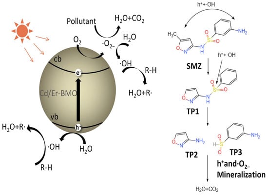 For the co-doping system in this paper, when the sample was irradiated with light with energy equal to or greater than the band gap energy, e− and h+ are formed and exist in the conduction band and valence band, respectively. As Cd2+ was doped in Er-BMO, especially 6% Cd/Er-BMO, the band gap was decreased, the generation of electron-hole pairs was promoted with the direct recombination of photogenerated electrons, and the holes were effectively suppressed. As such, a large number of e− and h+ were separated to the appropriate position to contact the pollutants, improving the degradation efficiency. ·O2− was developed when e− contacts O2, and then the h+ and active radical (·O2− and ·OH) were employed for the SMZ degradation based on the free radical capture experiment results. Note that h+ is mainly used directly for the degradation experiments, as opposed to using ·OH formed by h+. Thus, the possible degradation process is as follows: SMZ is hydrolyzed during the reaction to form the product TP 1, then h+ and ·OH break the S-N bond to form the products TP 2 and TP 3. Finally, all intermediate products further react with h+ and ·O2− to form smaller molecules or mineralize to CO2 and H2O []. In addition, in order to simplify the picture, we will replace the pollutant in the left half of Figure 5 with R-H, which will generate H2O and simple organic matter (R·) during the reaction process. The detailed photodegradation process is as follows: