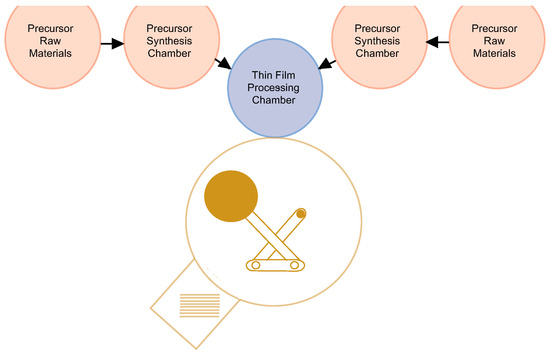 Figure 2 displays a schematic diagram of one modular design where multiple precursor synthesis chambers are connected under a controlled environment to a single thin-film manufacturing station. This configuration is intended for applications where multiple source precursors are required to perform a specific thin-film manufacturing step. In this arrangement, one or more precursors are synthesized in the precursor synthesis chambers, and are then transported concurrently or sequentially to the processing chamber, where they are consumed in a manufacturing (e.g., deposition or etching) step. As such, single or multiple precursors can be delivered from one synthesis chamber to a second synthesis chamber in sequence, with the resulting mixture of precursors then being transported controllably to the processing module, with the generation and delivery rates being synchronized with the manufacturing rate. The precursor synthesis chambers may be configured with respective gas or liquid delivery systems, or other subsystems, as required for the overall operation of the process flow.