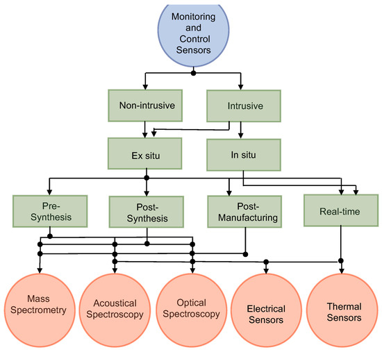 Figure 4 displays the instrumental loop hierarchy for such potential in situ and/or ex situ sensors, spectroscopies, and/or spectrometries. The instruments and sensors can be organized into two main categories: non-intrusive and intrusive. The non-intrusive systems employ non-invasive detection mechanisms, primarily optical spectroscopy, acoustical spectroscopy, or ion mass spectrometry to monitor and detect the composition and flow rate of: (i) raw materials and co-reactants prior to precursor synthesis; (ii) precursors and co-reactants post-precursor synthesis; and (iii) reaction byproducts and effluents post thin-film processing. They can also be applied to perform real-time measurements of precursor synthesis parameters, thin-film processing parameters, and thin film physical and chemical properties such as thickness and composition. The data would then be fed into the controller system to regulate and synchronize precursor generation rates as a function of thin-film formation or etch rates.