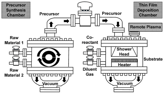 Figure 3 can be employed to implement the experiments described below. Additionally, to assist the reader, a detailed schematic drawing of the precursor synthesis chamber and the thin-film deposition chamber is shown in