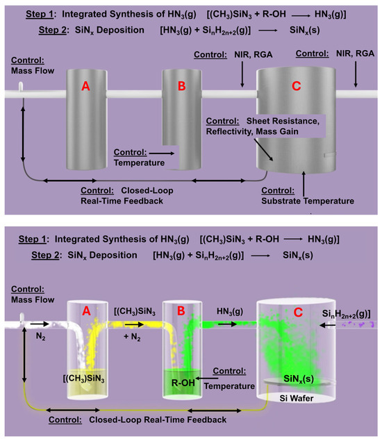 Figure 7 is a schematic representation of the instrumental architecture of in situ and ex situ monitoring and detection sensors for endpoint, real-time, closed-loop sensing and feedback for management of precursor synthesis parameters, thin-film processing parameters, and reaction byproducts and effluents conditions. Chamber A contains trimethylsilylazide; while chamber B contains the hydroxylic liquid and is the hydrazoic acid synthesis chamber; and chamber C is the SiN