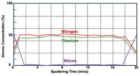 Figure 8 displays an illustrative XPS depth profile of the representative TiN film composition, namely, a ratio of Ti:N = 1:1 [