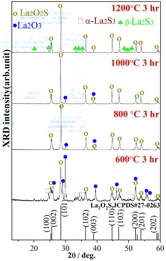 Figure 1 shows the XRD patterns of synthetic powders by solid-state reaction. XRD results show that hexagonal La2O2S (space group P-3m1) started to form at 600 °C, which closely matches the published data (JCPDS cards files: 71-2098). The main phase changed to the La2O2S phase at 800 °C and 1000 °C, but there was a second phase, namely La2O3. As the synthesis temperature increased to 1200 °C, the main phase La2O2S could be synthesized with traces of β-La2S3. The XRD results (Figure 1 of Ref. []), derived from using lanthanum nitrate hexahydrate and thiourea reacted in the solid phase at 1000 °C for 8 h, are significantly different from the present study, suggesting that raw materials have an influence on the preparation of La2O2S.