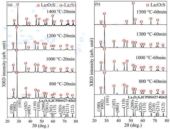 XRD patterns of La2O2S synthesis: (a) sintered at 800–1400 °C for 20 min; (b) sintered at 800–1500 °C for 60 min.