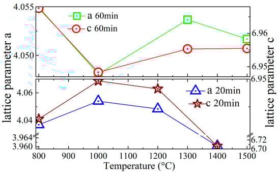 The dependence of the lattice parameters of synthetic La2O2S on sintering temperature is shown in Figure 4. Table 1 compares the lattice parameters of La2O2S and doped La2O2S. Theoretical calculations indicate that the lattice constants of La2O2S are a = 4.03–4.06 Å and c = 6.91–6.95 Å []. The lattice constants of La2O2S sintered at 800 °C for 20 min are similar to those of La2O2S synthesized by furnace combustion (a = 4.0313 Å and c = 6.9097 Å []) and to those of La2O2S synthesized using a one-step flux method (a = 4.0350 Å and c = 6.914 Å []). The lattice constants of La2O2S sintered at 1000–1200 °C for 20 min are similar to those of single-crystal La2O2S (a = 4.049 Å and c = 6.939 Å []) and annealed La2O2S (a = 4.04 Å and c = 6.99 Å []). The lattice constants of La2O2S sintered at 1400 °C for 20 min showed a significant decrease, which may be related to the presence of a second phase.
