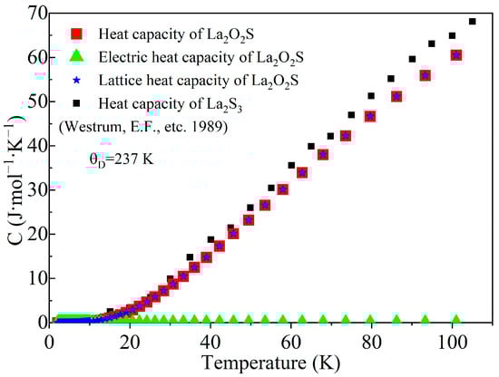 Figure 6 shows the specific heat curve and lattice contribution, Clat, evaluated by using the Debye model of La2O2S and synthesized at 1000 °C without a magnetic field. Considering that La2O2S does not contain magnetic-contributed heat capacity, the data of heat capacity were fitted by Debye’s law to estimate the electronic heat capacity part, Cele, and the lattice heat capacity part, Clat. The specific heat of La2O2S mainly originated from the lattice-specific heat contribution. The resultant Debye temperature θD of La2O2S was 237 K. The specific heat of the crystals was 60.5 J·mol·K−1 at 100 K. The specific heat of La2O2S decreased with decreasing temperature in the temperature range of 2 to 100 K. When the temperature reached 2 K, the specific heat value reached a minimum of 0.002 J·mol·K−1. Below 10 K, the change in specific heat was not very large. The low-frequency vibration mode only significantly increased heat capacity at low temperatures. There are few reports about the low-temperature specific heat of La2O2S. Evidence suggests that the heat capacity of β-La2S3 increases with increasing temperature []. The specific heat of La2O2S is smaller than that of γ-La2S3 []. Additionally, the specific heat of La2S3 is related to its crystal structure [].