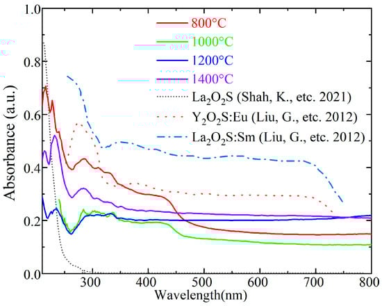 Figure 7 shows the UV–visible absorption spectra of synthesized La2O2S at 800–1400 °C. Compared with the theoretical calculation of La2O2S [], the synthesized La2O2S had different levels of absorption in the 240–300 nm range. The sintering temperature can change the response interval and the responsivity of La2O2S. The absorbance of the La2O2S compact increased as the sintering temperature increased from 800 to 1000 °C. Subsequently, the transmittance of La2O2S compact sintered at 1200 °C and 1400 °C decreased because of an impurity, namely second phase carbon. The absorption spectra of synthesized La2O2S are similar to the results for La2O2S:Sm and Y2O2S:Eu presented elsewhere [].