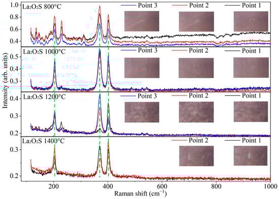 Considering the effect of synthesis temperature on the structure of La2O2S, the synthesized La2O2S was characterized by Raman spectroscopy at different temperatures, respectively. Figure 8 shows that the La2O2S synthesized at 800 °C generated distinct spectral peaks at 204.0 cm−1, 229.2 cm−1, 369.7 cm−1, and 401.3 cm−1. Four characteristic peaks of La2O2S were present at 107 cm−1, 201 cm−1, 383 cm−1 and 398 cm−1, based on theoretical calculations of phonons and theoretical phonon mode wavenumbers, respectively []. The peak at 404 cm−1 corresponded to the Eg mode and was ascribed to the La-O stretching vibrations []. Another low-intensity peak at 201 cm−1 was assigned to the A1g mode related to the La-O bending vibrations [,]. It was evident that the Eg peak for La2O2S synthesized at 800 °C shifted positively. This implies that a change occurred in the covalence band of La2O2S synthesized at high temperatures. This change may influence the La-O stretching vibration peak because of an electron from carbon or graphite abrasives diffusing to La2O2S. The experimental phonon mode frequencies of La2O2S are different from those of Y2O2S despite their approximate lattice structures and constants. The experimental phonon mode frequencies of yttrium oxysulfide contains one-dimensional modes, A1g (258 cm−1 and 474 cm−1), and two-dimensional modes, Eg (143 cm−1 and 444 cm−1).
