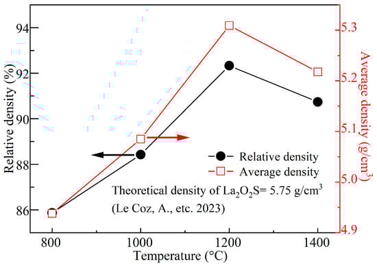 The estimation of the relative density of the La2O2S ceramics was conducted by employing the value of 5.75 g/cm3 []. The relative densities of the synthesized La2O2S ceramics were 82%, 88%, 92%, and 90%, respectively. The densities of the synthesized La2O2S ceramics were all lower than the theoretical density, indicating that the synthesized materials had a small number of voids. Additionally, as can be seen in Figure 9, the relative density of La2O2S gradually increased with increase in the sintering temperature. At 1400 °C, a slight decrease in relative density occurred, which may have been caused by the diffusion of the light element carbon into the La2O2S sample.