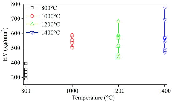 Figure 10 shows the hardness values of La2O2S synthesized at different sintering temperatures. The average hardness of La2O2S was 331.8 kg/mm2 for 800 °C, 552.2 kg/mm2 for 1000 °C, 562 kg/mm2 for 1200 °C, and 571.3 kg/mm2 for 1400 °C. The hardness of La2O2S increased with the increase in the sintering temperature. Further, the higher the sintering temperature was, the faster the grains grew. The La2O2S compacts became more compacted under pressure. Vickers hardness values of the hot-pressed La2O2S ceramics sintered at 1200 °C and 1250 °C were approximately 550 kg/mm2; the hardness of La2O2S depends on grain size []. The hardness of La2O2S is larger than that of the dense Gd2O2S ceramics (450–500 kg/mm2) []. The lanthanum sesquisulfide (La2S3) ceramics and the alkaline-earth–rare-earth sulfide family, with the formula A(Re)2S4, where A = Ca, Sr, or Ba and Re = La, Pr, Sm, had larger hardness values (about 600 kg/mm2) [].