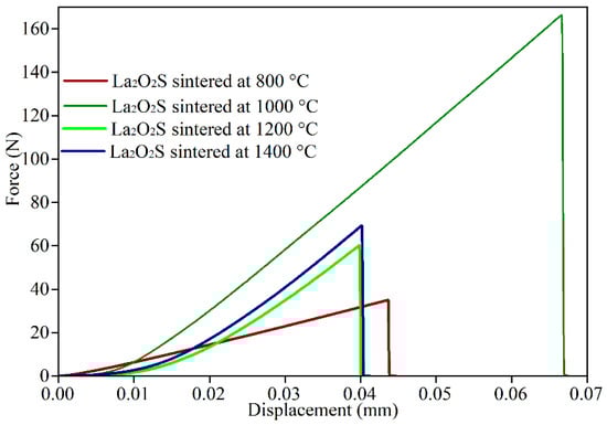 The molding temperature dependency of the three-point bending strength of La2O2S compacts is displayed in Figure 11. During the cutting process, a fracture in the compact developed at the 600 °C sintering temperature, which was thought to be the result of inadequate sintering. As a result, three-point bending testing was performed between 800 and 1400 °C. The three-point bending strength of La2O2S increased and then decreased with increasing temperature; it reached a maximum at 1000 °C. The modulus of elasticity of sintered La2O2S at 800 °C, 1000 °C, 1200 °C, and 1400 °C was calculated by the formula 28.3 MPa, 88.6 MPa, 53.8 MPa, and 61.9 MPa, respectively. No reports on the three-point bending strength of La2O2S have been retrieved. More studies are needed to modify the mechanical strength of Al2O3 [] or WC [] ceramics by incorporating La2O3 additives or improve mechanical strength by adding La-based rare-earth metals to M2 steel in the Electroslag Casting Process [].