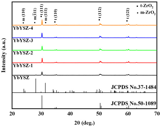 The as-sprayed 8YSZ coating is mainly composed of a tetragonal phase, with a small amount of cubic phase and monoclinic phase. According to the equilibrium phase diagram, 8YSZ should be composed of monoclinic and cubic phases (c-ZrO2) at room temperature [23]; however, due to the very fast cooling rate of molten droplets during plasma spraying, phase equilibrium and eutectoid phase transformation are difficult to fully achieve, and a portion of the tetragonal phase remains in small particles. This type of tetragonal phase is commonly referred to as non-equilibrium tetragonal phase (t’-ZrO2) [24,25], which is prone to transform into t and c phases at high temperatures. When the non-equilibrium tetragonal micro-nano dual-scale layer is exposed to a high temperature of 1300 °C, the Y and Yb elements redistribute, forming equilibrium tetragonal and equilibrium cubic phases [26,27,28]. The diffusion of Y and Yb elements is essentially the thermal vibration of Y3+ and Yb3+. However, this thermal vibration requires a certain temperature as a condition, and it is difficult to achieve the redistribution of the two elements at lower temperatures. Therefore, the formation of m-ZrO2 has a significant delay (or latency), and there are reports showing that the latency of 8YSZ can be as long as 150 h [29]. In addition, the diffusion rate of Yb3+ is smaller than that of Y3+, and the heat-treatment time for this study is relatively short (≤8 h). Fang et al. confirmed that the Yb element can better ensure the thermal stability of ZrO2 at 1500 °C × 600 h. The micro-nano dual-scale layer did not undergo a phase transition, which is consistent with the expected experiment results.