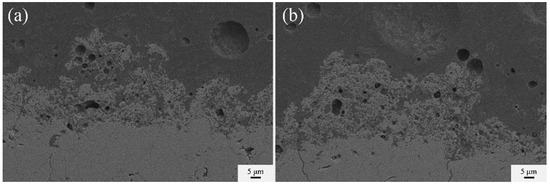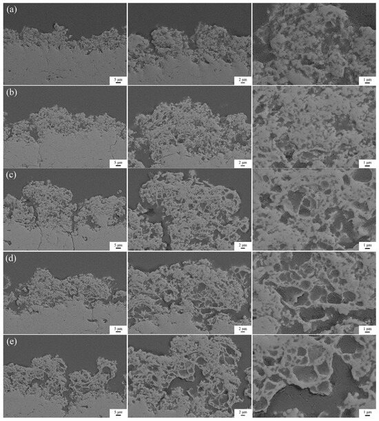Figure 11 shows the interface between the coating and CMAS after wetting for 600 s. The as-sprayed YbYSZ underwent slight structural degradation, and the loosely bonded areas at the top of the micro-nano dual-scale layers peeled off. The other four samples subjected to 1300 °C heat treatment did not exhibit large-scale delamination of micro-nano dual-scale layers, which is attributed to the healing of small pores and tighter particle bonding caused by heat treatment. It is conducive to resisting structural degradation. Inspired by this, short-term heat treatment of the coating after as-sprayed micro-nano dual-scale layers can alleviate the drawbacks of weak cohesion and poor bonding strength to some extent. However, by observing the enlarged area in Figure 11e, it can be observed that the hollow sphere region formed by sintering inside the micro-nano dual-scale layer undergoes structural degradation, and the hollow sphere structure is filled and destroyed by molten CMAS. It can be inferred that the structural evolution caused by sintering has a destructive effect on the anti-CMAS corrosion performance of micro-nano dual-scale layers. With the extension of service time, the micro-nano dual-scale layers will lose their protective effect on the entire coating system after large-scale sintering.