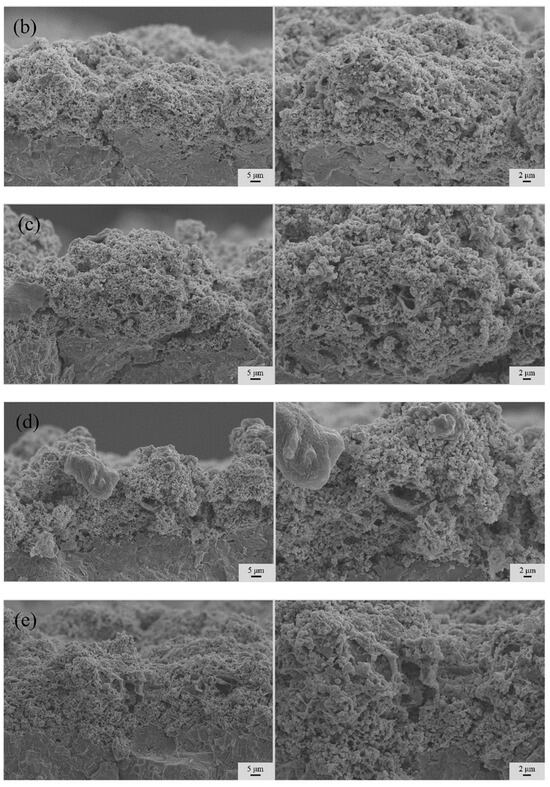 Figure 6 shows the fracture morphologies of the micro-nano dual-scale layer. Initially, the untreated coating exhibits well-defined, densely packed nanoparticles, characterized by a distinct nanoparticle morphology and uniform distribution; however, after 0.5 h of heat treatment, the boundaries between nanoparticles begin to blur, indicating the onset of sintering, with initial fusion leading to the formation of small pores. This suggests early structural relaxation. After 1 h, significant fusion occurs, resulting in the loss of particle interfaces and the formation of larger pores, which may lead to a decrease in the micro-nano dual-scale layer’s density and potentially compromise its mechanical strength. By 2 h, the sintering becomes more pronounced, with the complete fusion of nanoparticles, the disappearance of distinct boundaries, and the emergence of large, irregular pores. This indicates a substantial reduction in the coating’s density. After 8 h of heat treatment, the original nanoparticle morphology is entirely lost, replaced by large-scale sintered agglomerates and extensive porosity. This complete transformation highlights the serious impact of prolonged sintering, resulting in a significant decrease in coating density and thermal protection capability. These observations underscore the importance of controlling heat treatment conditions to preserve the functional properties of micro-nano dual-scale coatings in high-temperature applications.