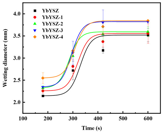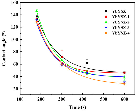 Figure 8 and Figure 9 present the time-dependent curves of wetting diameter and contact angle. The wetting diameters of all samples gradually increase with time, and the increase in wetting diameter is significant after 300 s. The wetting diameters of YbYSZ and YbYSZ-1 were relatively small throughout the entire testing time, while YbYSZ-3 and YbYSZ-4 had the worst wetting due to the longer heat treatment time. Compared with YbYSZ, the wetting diameter of YbYSZ-4 increased by 8.52%, from 3.52 μm to 3.82 μm. YbYSZ without sintering exhibited better anti-wetting performance compared with the other samples, with its wetting diameter remaining the lowest throughout the entire time, indicating that its resistance to CMAS corrosion at high temperatures is superior to those of the other samples.