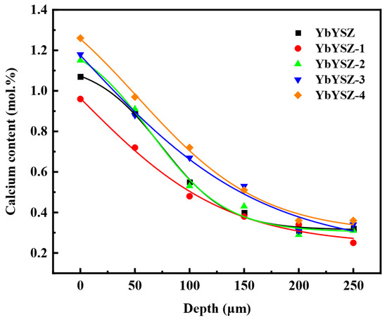 Figure 10 shows variation curves of Ca content with depth after heat treatment for 600 s. Ca content is lowest in YbYSZ-1 infiltration, and 0.5 h heat treatment did not damage the protruding structure, but instead made it denser, hindering the infiltration of molten CMAS. After heat treatment times exceeding 1 h, the number of sheet-like or hollow spherical structures inside the micro-nano dual-scale layer gradually increased, and the porosity increased, leading to an increase in the penetration of molten CMAS. Similarly, due to the absence of widespread degradation of the protruding structure, the Ca element content in all samples rapidly decreased within the range of 0 to 100 μm. The micro-nano dual-scale layer after 8 h of heat treatment still had a hindering effect on the penetration of molten CMAS.