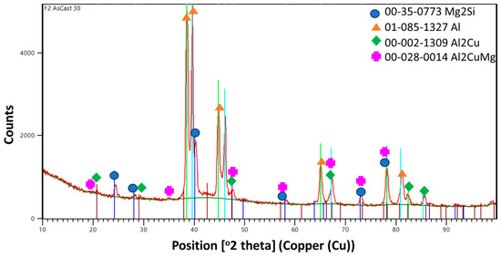 The microstructure of the alloys was studied using a Leica DMI5000M optical microscope (LEICA, Wetzlar, Germany) and an EI Quanta 450 scanning electron microscopy (SEM) with Energy Dispersive Spectroscopy (EDX) analysis. The composition of the alloy produced by HPDC was determined using X-ray diffraction (XRD) with a Philips X’Pert Pro MPD PW3040/60 diffractometer (Malvern Panalytical Ltd., Malver, UK), equipped with a copper anode operating at 40 kV and 40 mA (1.6 kW). Scans were performed in a 2θ range from 10° to 90°, with a step size of 0.02° 2θ and a duration of 2 s per step. The X-ray diffraction patterns were indexed with the PDF-2 database from the International Center for Diffraction Data (ICDD).