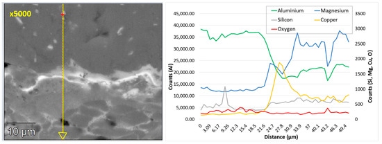 The Al80Mg10Si5Cu5 alloy was converted into powder by gas atomization with a Leybold VIGA 2S atomizer (Leybold products, Cornellà de Llobregat, Spain) with Argon at a pressure of 2.4 MPa, and the melt temperature was set at 850 °C. Subsequently, a qualitative and semiquantitative analysis was performed by averaging the composition from three measurements, each covering over 100 particles.