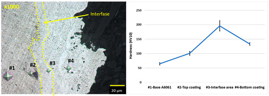 Vickers indentations were employed to evaluate the hardness of the new material with the coating. The Vickers hardness was determined using a Vickers hardness tester model FV-700 (Mitutoyo, Kawasaki, Japan), selecting after several trials the load of 10 kgf as the best option. Measurements were taken at the top, bottom, and interface areas of the coating. Additionally, hardness measurements were taken on the substrate to ensure that the thermal process did not affect the mechanical properties of the base material. In total, 3 samples were analyzed.