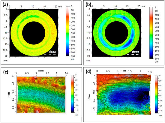 After completing the BOD tests, the determination of the wear coefficient rate was conducted using 3D laser scanning confocal microscopy (DCM 3D, Leica, Madrid, Spain). A total area of 20.8 mm × 20.2 mm and a height of 684 µm were measured using a 5X objective. At least 16 2D profiles were obtained using Leica map software version 3.2. Additionally, for comparison, four radii of 2.5 mm × 1.8 mm and a height of 275 µm were measured using the same 5X objective. The total volume loss was calculated, and wear coefficients were obtained in mm
