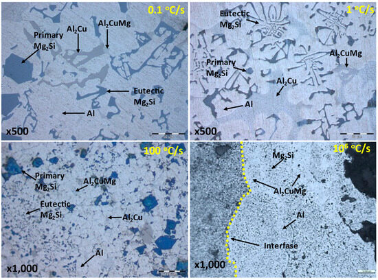 Microstructure and chemical analysis results indicated good adhesion between the substrate and the coating. The high solidification rates led to fewer phases and a finer microstructure, resulting in the disappearance of the Al2Cu phase and the precipitation of Mg2Si throughout the matrix. In the interface area, a high presence of elemental copper precipitated as the Al2CuMg phase, providing high hardness without cracking.