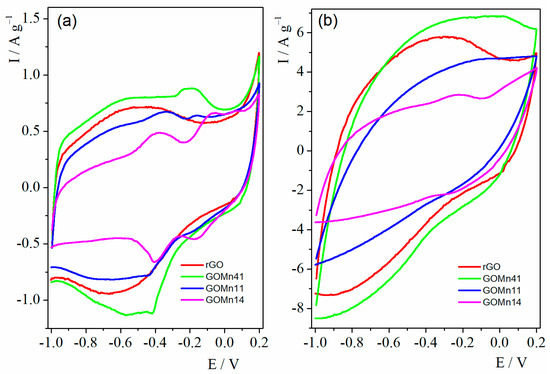 Cyclic voltammetry (CV) was employed to evaluate the electrochemical properties of the electrodes prepared with the hybrid materials using a three-electrode system. We carried out CV measurements at 5, 10, 20 and 50 mV/s. Figure 3 compares the CV profiles obtained for rGO, GOMn41, GOMn11 and GOMn14 at scan rates of 5 and 50 mV s−1, as references for low and high scan rates within the potential range of −1.5 to 0.2 V. The CV curve for rGO at 5 mVs−1 (Figure 3a) exhibits a pseudo-rectangular shape without any distinct Faradaic peak in this potential window. Typically, a rectangular CV shape is characteristic of carbonaceous materials that store charge through the formation of the electric double layer at the electrode–electrolyte interface [68]. However, a rounded shape was detected in the cycle, suggesting some pseudocapacitive contribution due to the oxygenated functional groups on rGO [68]. On the other hand, the CV curves for GO/Mn3O4 hybrids deviate from the rectangular shape, exhibiting slight hump peaks at low potentials, a signature of pseudocapacitive behavior of the electrode materials.