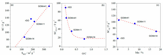The plots reveal interesting information. Figure 5a shows a linear correlation between specific capacitance and specific surface area. This behavior agrees very well with results found for carbon-based supercapacitors [71,72]. Accordingly, GOMn41, with the highest SBET, shows the best performance as a supercapacitor electrode, while both rGO and GOMn11, which share similar SBET values, exhibit comparable specific capacitance values of ~136 F g−1. A similar trend is observed when correlating specific capacitance with the micropore volume determined through CO2 adsorption, as seen in Table 1. This behavior has previously been reported for carbonaceous materials [72] and attributed to the existence of an electric double-layer mechanism. The authors considered that the inclusion of carbonaceous materials enhances the specific surface area of the electrodes, facilitating the ion contact and promoting the EDLC mechanism, which relies on ion adsorption [72].