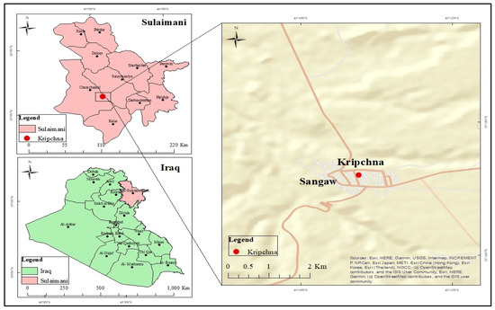 A greenhouse experiment was conducted in the Sheikh Jamal private field at Krbchna, Sangaw, which is located 77 km southwest of Sulaymaniyah Province in the Iraqi Kurdistan region. The global position system (GPS) coordinates (latitude: 35°28′20″ N, longitude: 45°27′70″ E, altitude: 979 m) and a geographical map of the research area are shown in Figure 1 [18]. The research area has an arid and semiarid climate [19].
